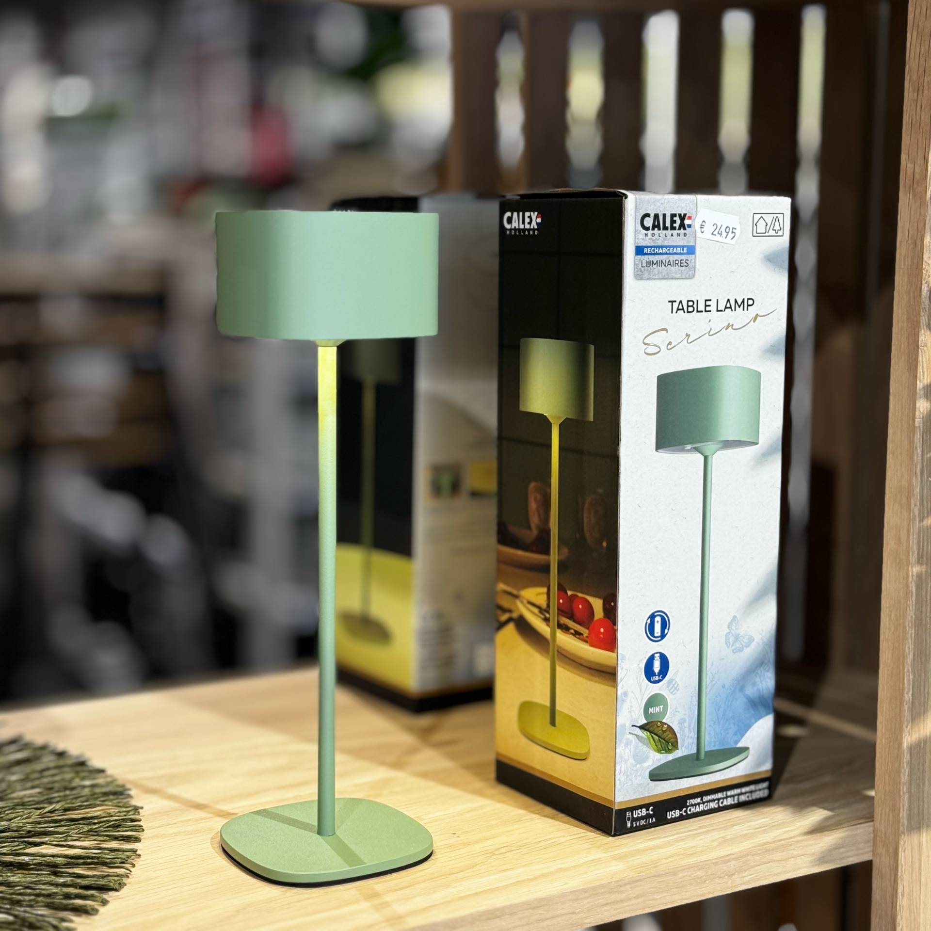Calex lampjes voor binnen of buiten, op accu. Oplaadbaar via bijgeleverde usb kabel. In groen zwart en ivoor kleur
